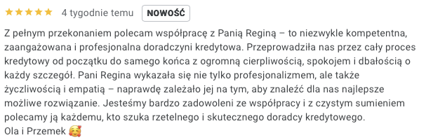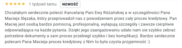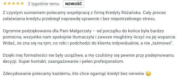 Dziś wielu kredytobiorców patrzy z obawą na to co dzieje się w rynku kredytów. Wiem to, bo codziennie rozmawiam ze swoimi Klientami. Uważam i to zawsze powtarzam rozmówcom, że w takiej sytuacji najgorszy jest brak planu na zarządzanie kredytem. Kiedy nie wiesz na co możesz liczyć, z czym wiążą się poszczególne decyzje, na jakie ryzyko możesz sobie pozwolić. Dlatego w Centrum RÓŻAŃSKA KREDYTY i NIERUCHOMOŚCI, nasi Klienci mogą liczyć na długofalowe wsparcie i doradztwo na najwyższym poziomie. Dzięki temu, ze spokojem podejmują decyzje i oszczędzają na swoim kredycie. Czego dowodem są poniższe opinie.
